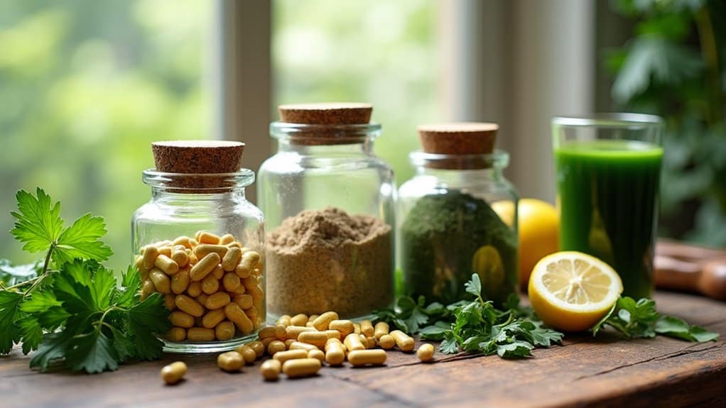 Herbal supplements support your body’s natural detoxification processes by enhancing key elimination pathways through the liver, kidneys, digestive tract, lymphatic system, and skin. You’ll benefit from powerful compounds like silymarin in milk thistle for liver health and polyphenols that provide antioxidant protection. When combined strategically, herbs like dandelion root, turmeric, and burdock create synergistic effects that amplify their cleansing properties. Understanding these natural allies can transform your approach to maintaining peak wellness.